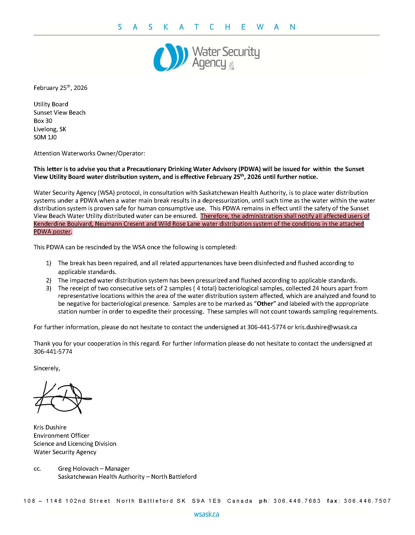 Precautionary Drinking Water Advisory for some areas of Sunset View Beach