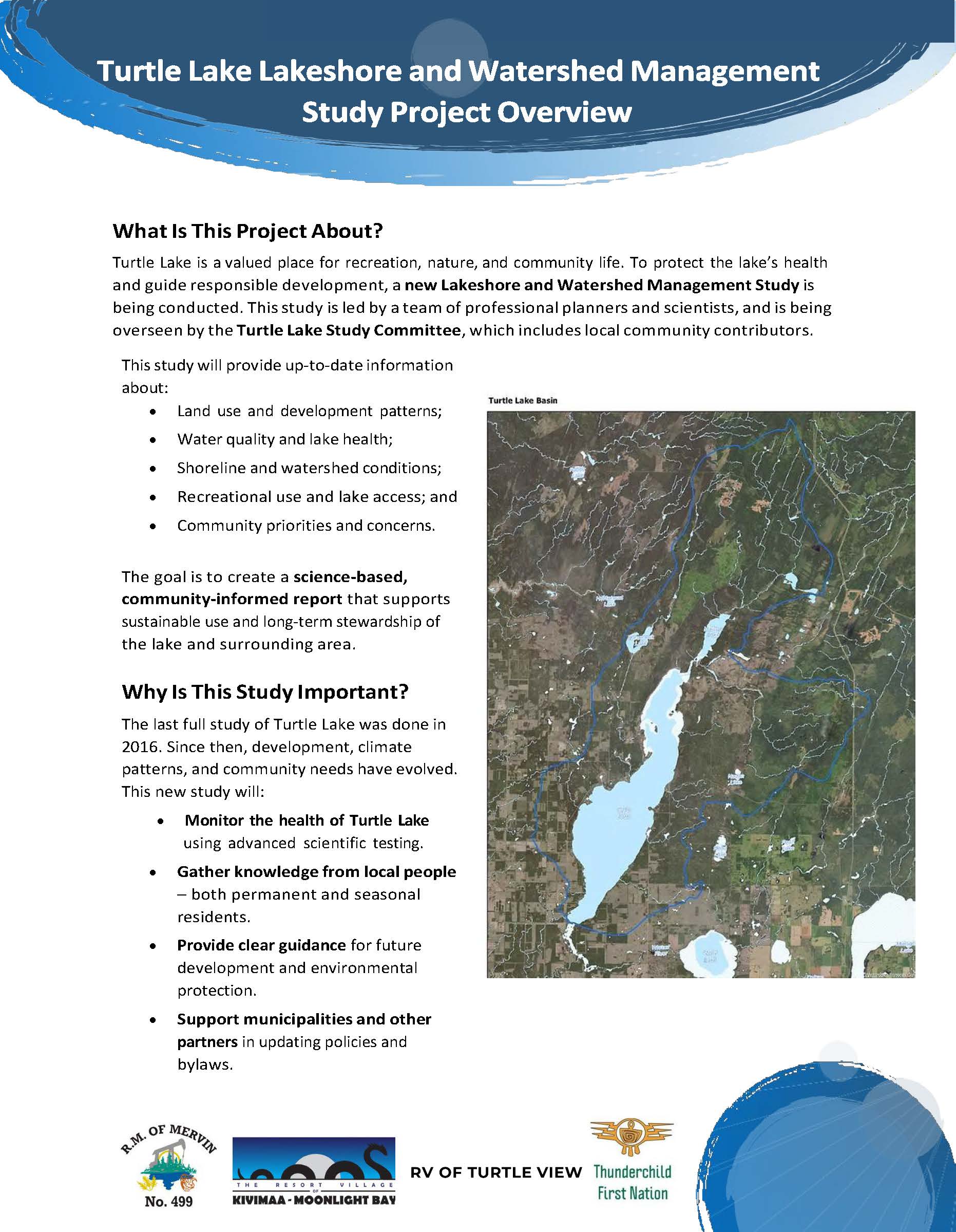 The state of Turtle Lake and its surrounding watershed has been studied in each decade since 1983 (i.e. in 1993, 2004, and 2016). It is now time to prepare an update with current information and scientific methods. The Rural Municipality of Mervin, and the Resort Villages of Kivimaa-Moonlight Bay and Turtle View received funding support from the Saskatchewan Targeted Sector Support Initiative to launch the Turtle Lake Lakeshore and Watershed Management Study as a joint project. Thunderchild First Nation are also participating to guide the Study.